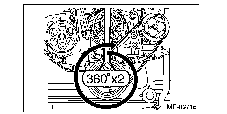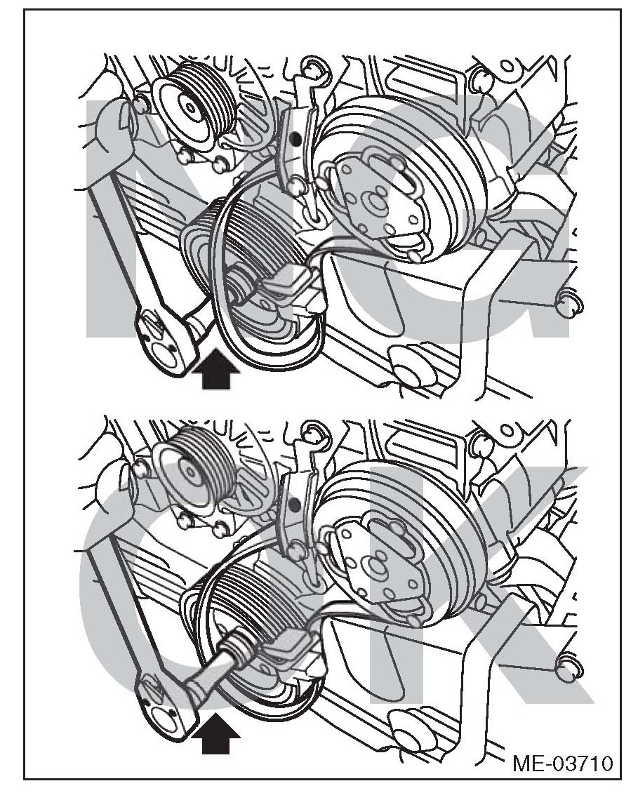 16) Make sure that the belt ribs are properly riding on the grooves of the pulleys, and turn the crank pulley slowly to the right twice to break in the rear side belt.
