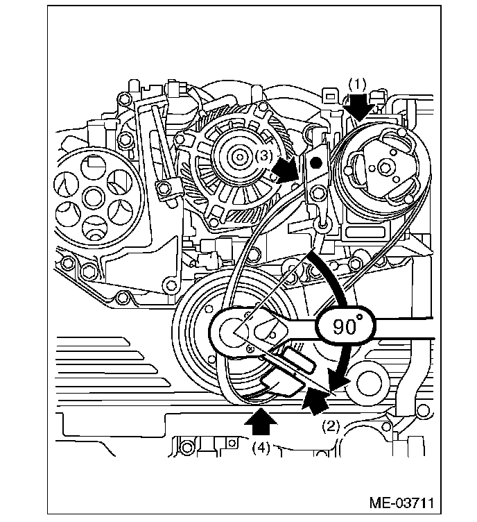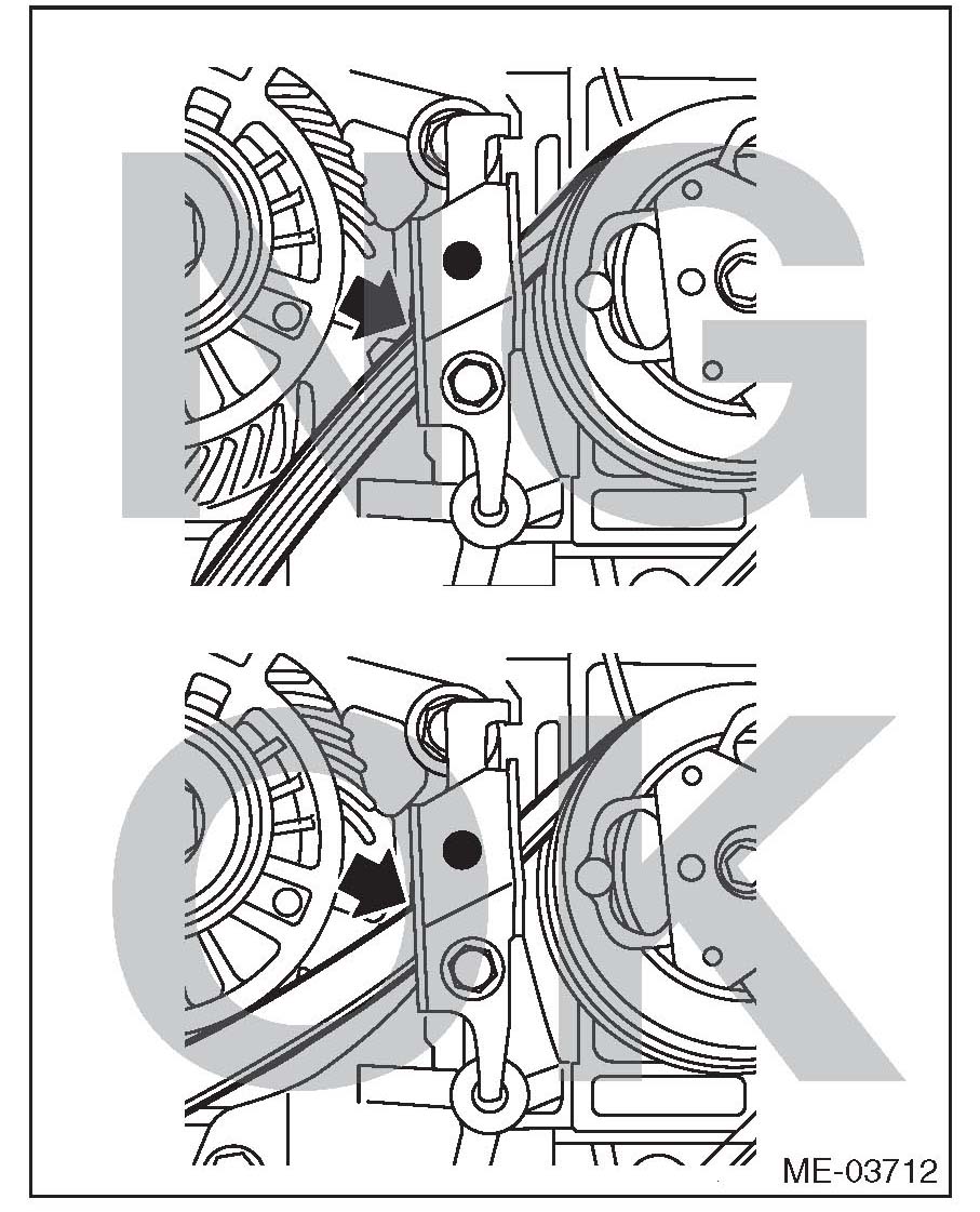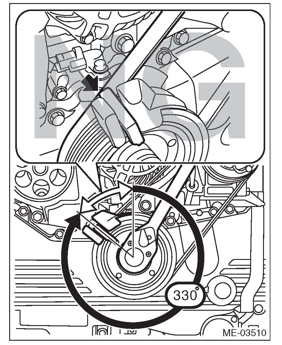 11) While checking for the following, turn the crank pulley slowly to the right by approximately 900 and set the belt guide to the position shown in the figure.