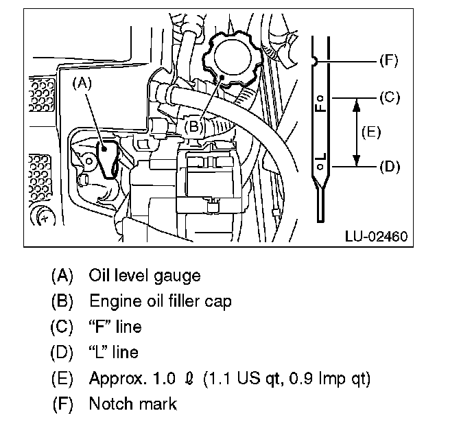 4) Remove the oil level gauge again and check the reading. If the engine oil level is below "L" line, check for oil leakage from engine and add oil to bring the level up to "F" line.