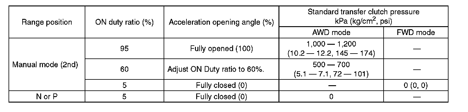 Check the transfer clutch pressure in accordance with the following chart in the same manner as for line pressure.