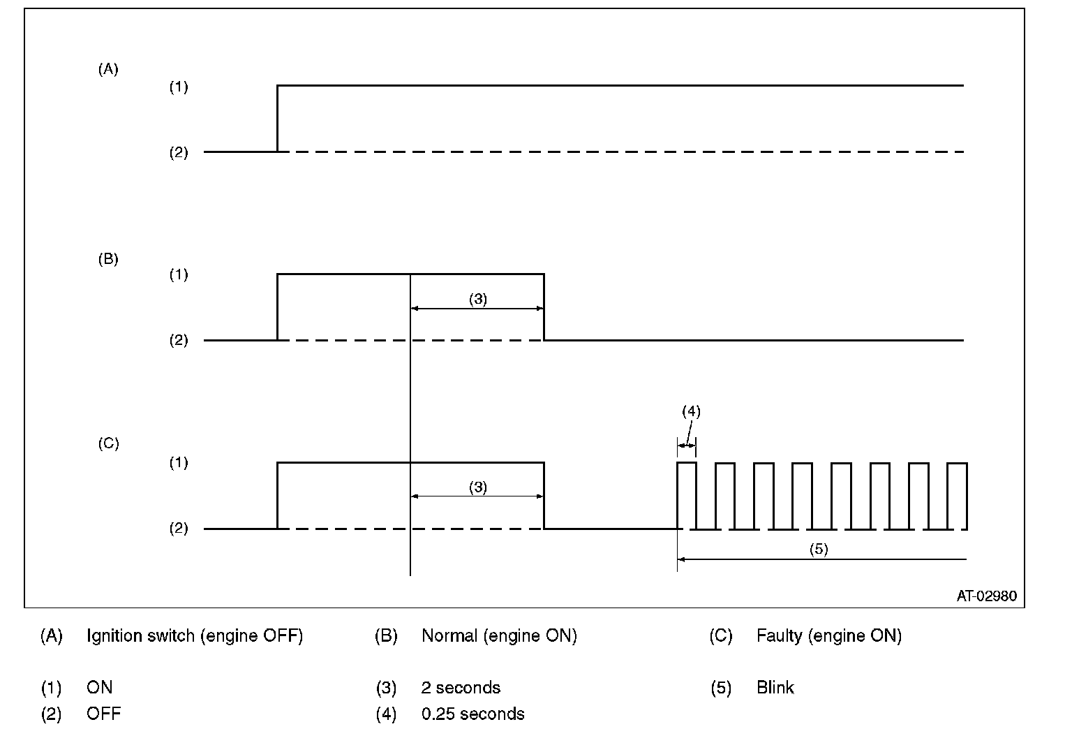 If there is a malfunction with an on-board diagnosis part, the ATF temperature warning light will flash. The flashing will continue from when the malfunction is confirmed after starting the engine, until the ignition switch is turned to OFF. The malfunctioning part or unit can be identified by DTC during the on-board diagnostics operation. Problems which occurred previously can also be identified through the memory function. If the ATF temperature warning light does not show a problem (although a problem is occurring), the problem can be determined by checking the performance characteristics of each sensor using the Subaru Select Monitor. The ATF warning light signal patterns are shown in the figure.