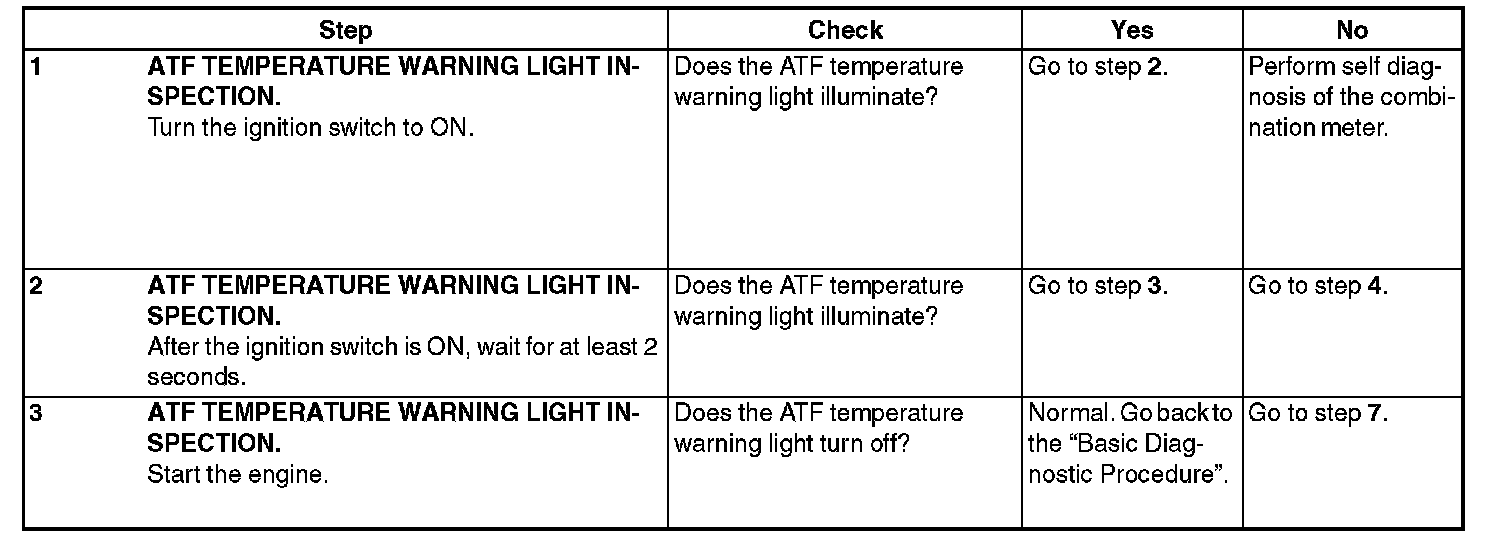 If the ATF temperature warning light does not function properly, check the ATF temperature warning light circuit.