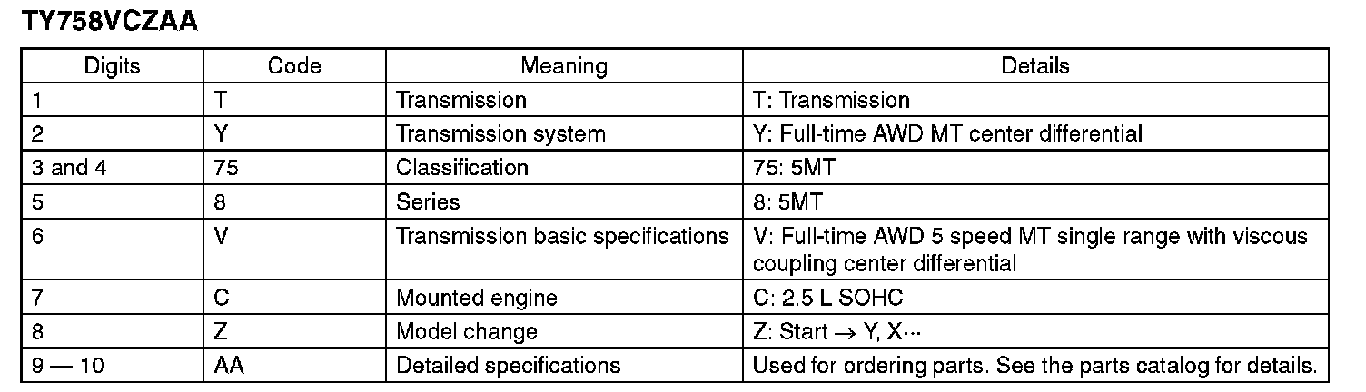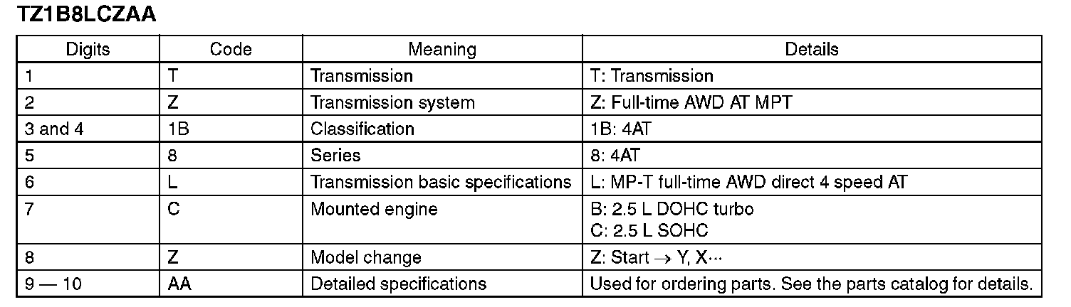 The model number plate indicates: the applied model, the option code, the trim code, the engine type, the transmission type, and the exterior color code. This information is helpful when placing orders for parts.