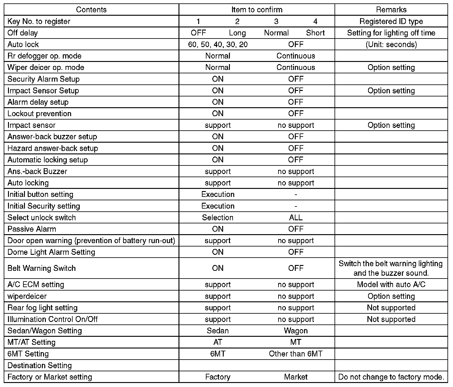- Be sure not to change Factory or Market setting except installation of new body integrated unit.