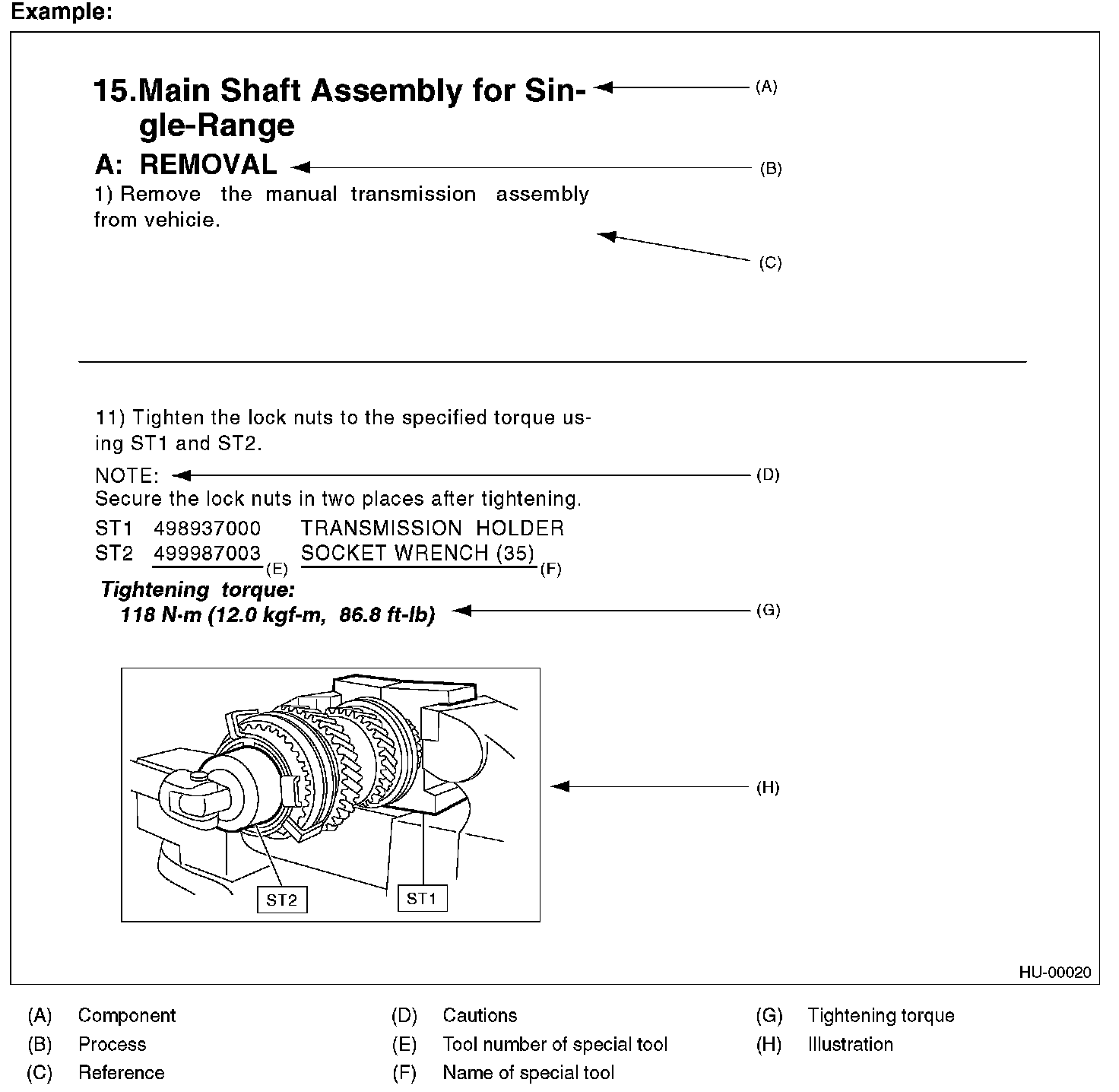 Illustrations are provided for each component. The information necessary for repair work (tightening torque, grease up points, etc.) is described on these illustrations. Information is described using symbol. To order parts, refer to parts catalogue.
