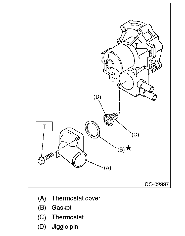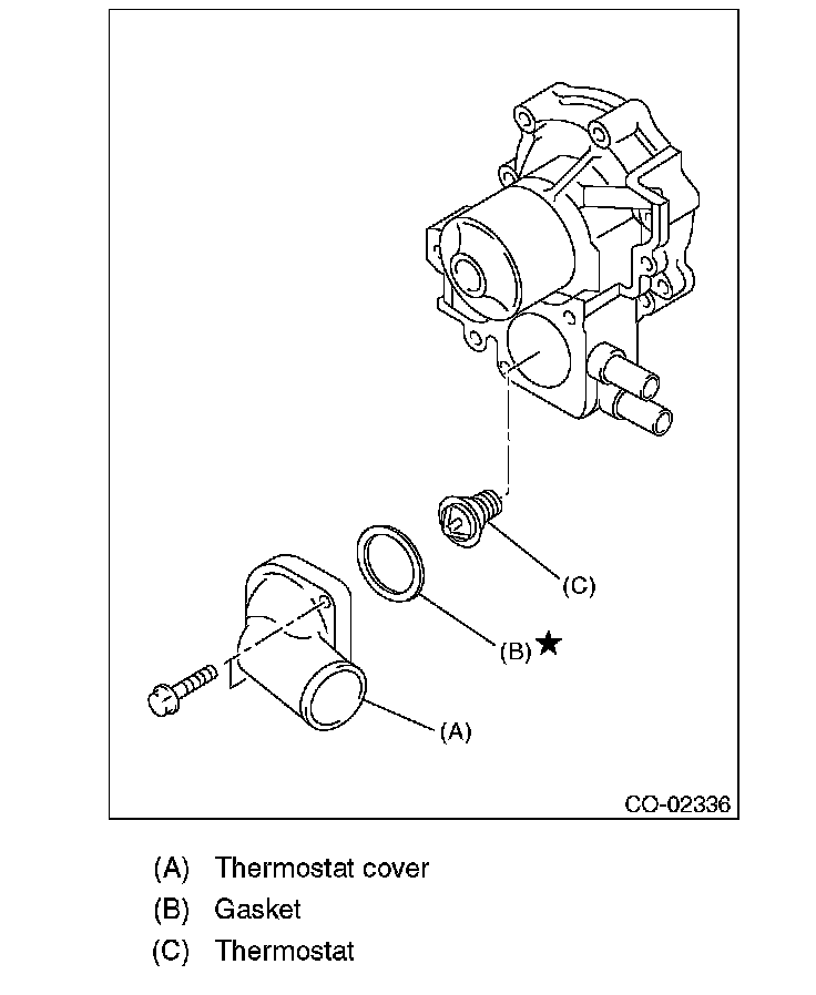 7) Remove the thermostat cover, and then remove the gasket and thermostat.
