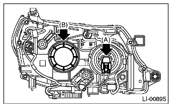 4. Remove the bulb assembly (A) then remove the high beam. To remove the low beam, remove the back cover (B), and then go to Step 5.