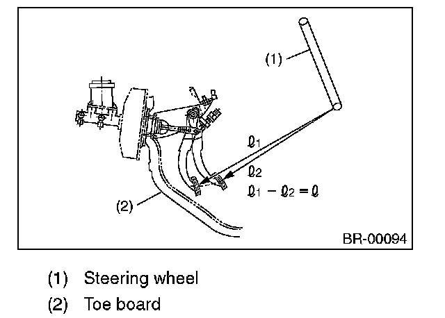 Run the engine at idle after warming up the engine, and depress the brake pedal with a force of 500 N (51 kgf, 112 lbf). Measure the distance between the brake pedal and steering wheel. Release the pedal, and measure the distance between pedal and steering wheel again.