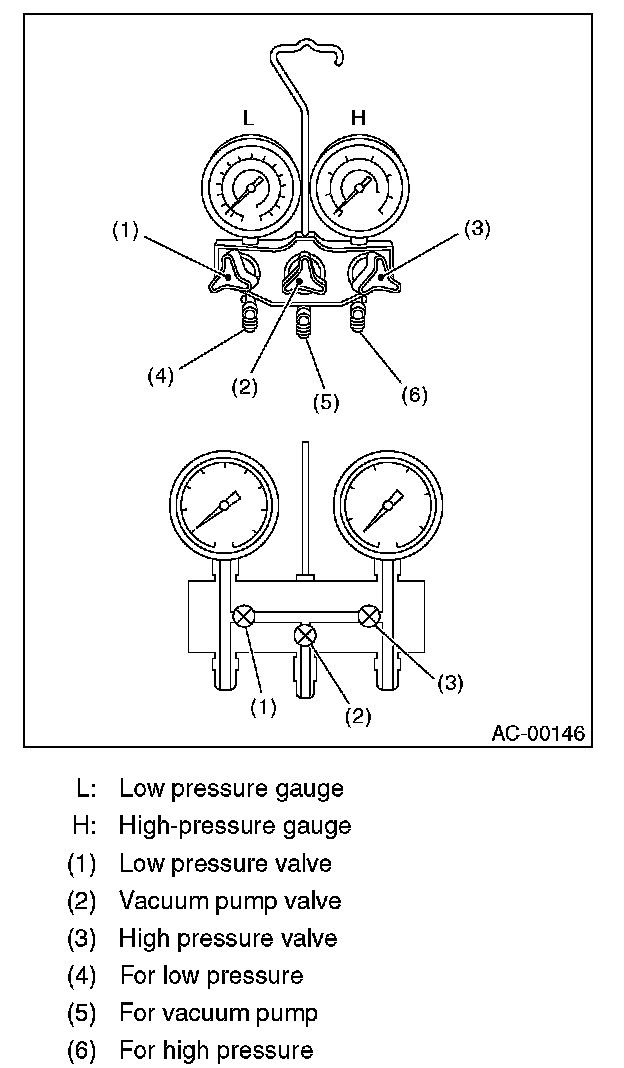 4. Operate the vacuum pump, and open the low pressure side and high pressure side valves. Open the center manifold hose valve, and start evacuation.