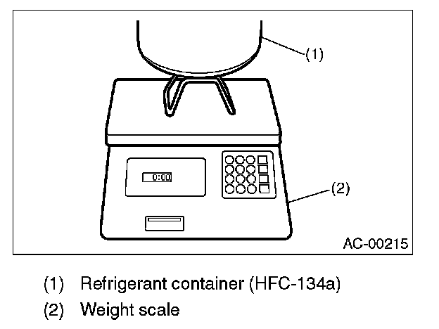 11. When a 13.6 kg (30 lb) refrigerant container is used, measure the weight of the refrigerant first on a scale, then connect to the center manifold hose.