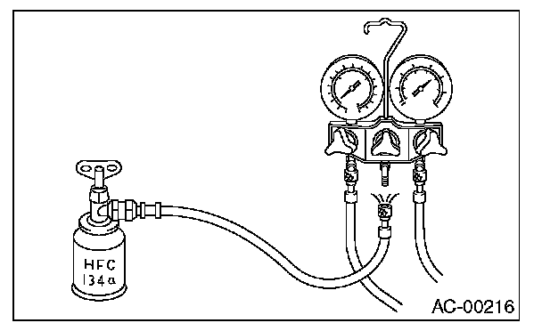 18. If the HFC-134a supply container becomes empty, close all valves, and close the can tap valve to replace the empty container. After replacing the HFC-134a supply container with a new container, air purge first, then restart the filling procedure.