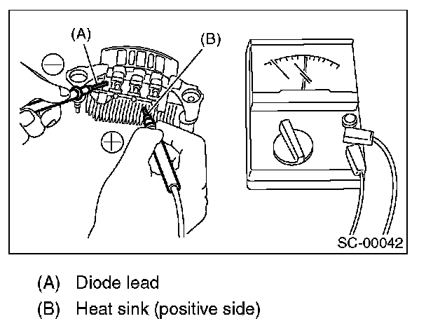 Check for continuity between the diode lead and positive side heat sink. If resistance is 1 ohm or less only in the direction from the diode lead to the heat sink, the positive diode is OK.