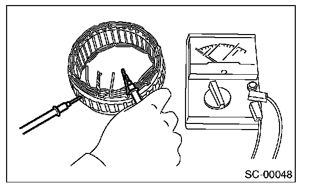 Inspect the continuity between the stator coil stator core and lead wire terminals. If the resistance is 1 ohm or less, the stator coil is grounded. Replace the stator assembly.