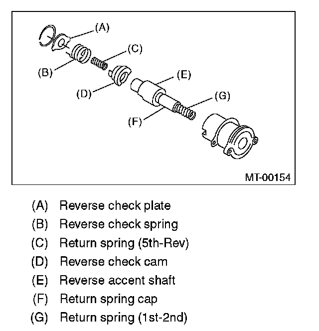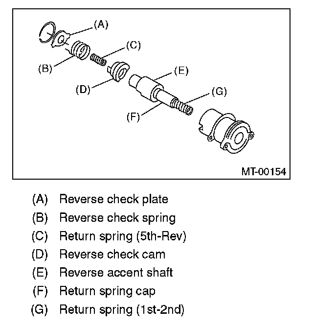 2) Remove the reverse check plate, reverse check spring, reverse check cam, return spring (5th-Rev), reverse accent shaft, return spring cap and return spring (1st-2nd).