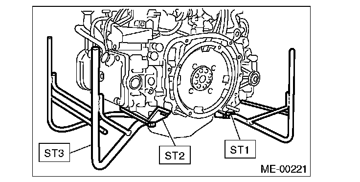 1) After removing the engine from body, secure it to ST in the following procedure.