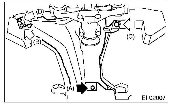 3. Remove the bolt (A), nut (B) and clip (C) to remove center heat shield cover.