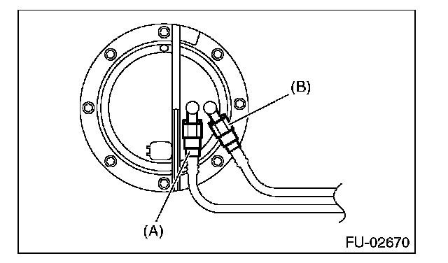 7. Disconnect the quick connector of fuel delivery tube (A) and jet pump tube (B).