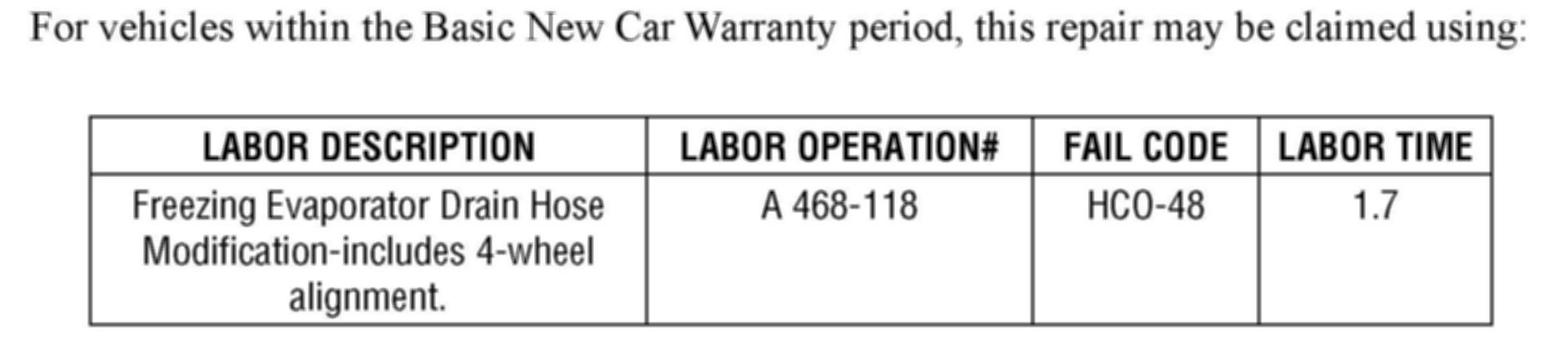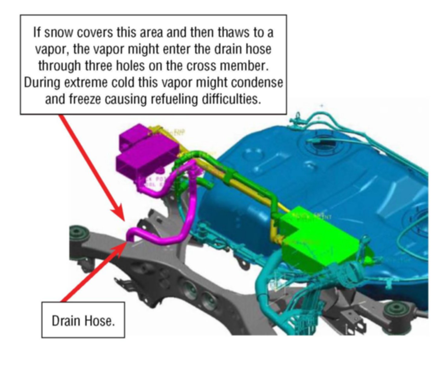 If the vehicle is driven through deep snow and it lodges in the rear frame area, it may melt and allow vaporized water to enter into the open end of the evaporator drain hose that is located at the cross member where the LH rear lateral link is connected. In extremely cold conditions this vapor could freeze and become ice which might cause the fuel fill nozzle to shut off when refueling the vehicle. To remedy this condition, follow the service procedure listed below.