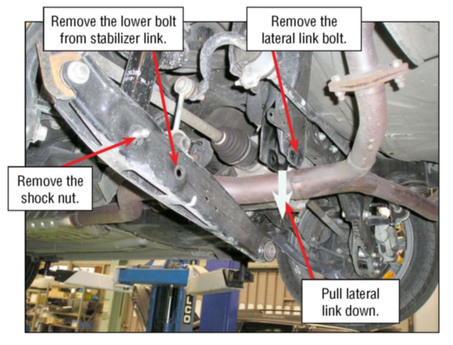 2) Remove inside of the left rear lateral link. (See picture below.)