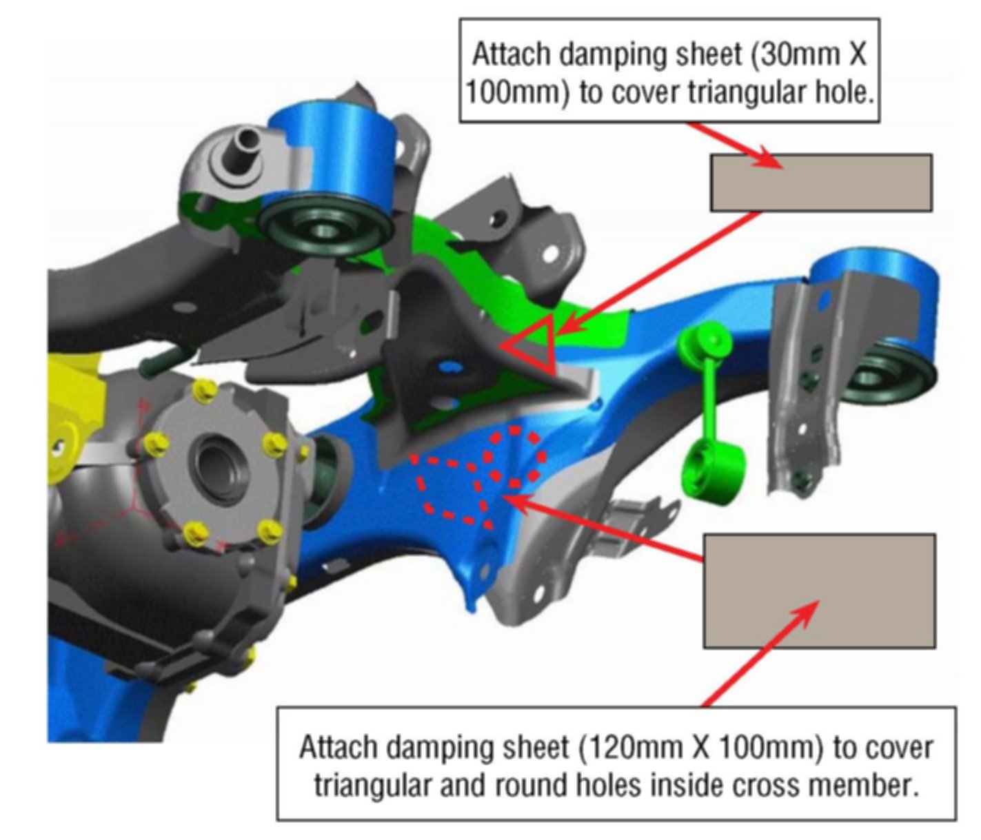 4) Attach the damping sheets to cover the openings in the cross member.