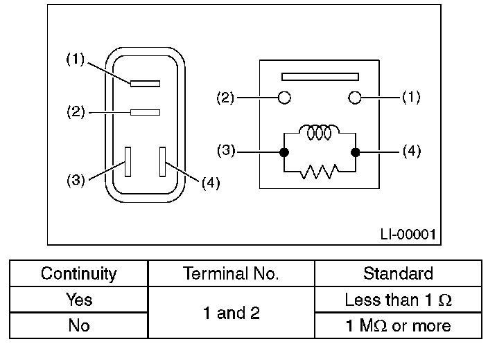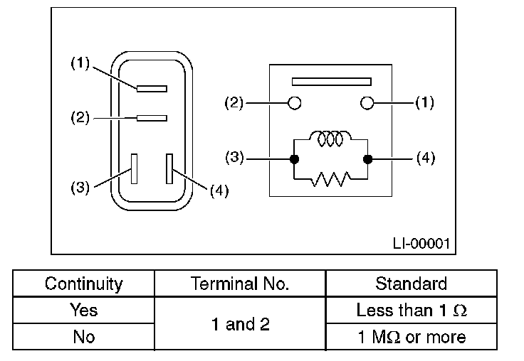 Measure the resistance between the tail and illumination relay terminals when connecting terminal No. 4 to the battery positive terminal and terminal No. 3 to the battery ground terminal.