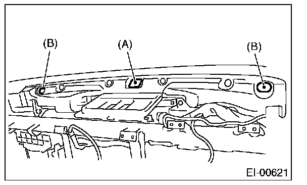 1. Insert the matching pins (three places) on the instrument panel tip into the grommet (A) and (B) on the body panel side.