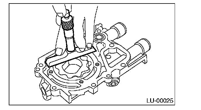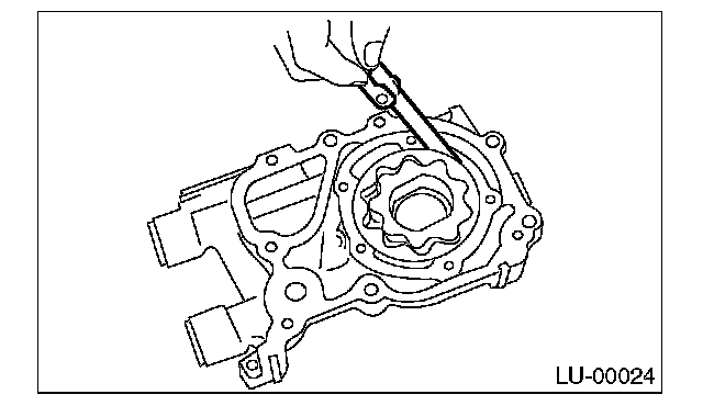 Measure the gap between the inner rotor and the oil pump case to measure the clearance between the oil pump inner rotor and the oil pump cover as shown in the figure. If the clearance is out of specification, replace the rotors or the oil pump case.