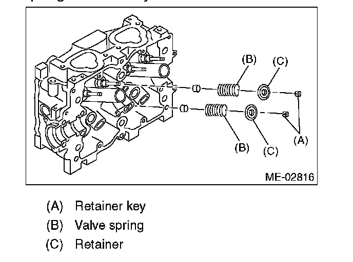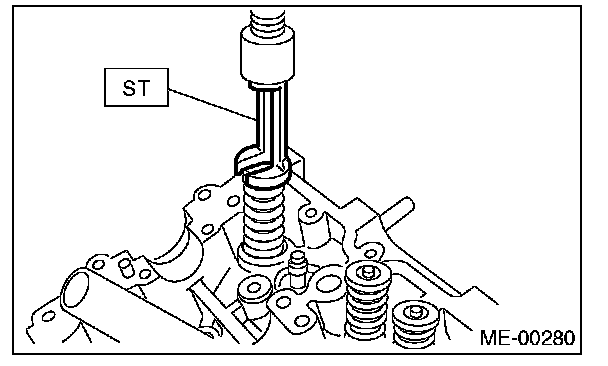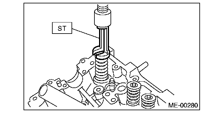 2. Compress the valve spring and remove the valve spring retainer key using ST. Remove each valve and valve spring.