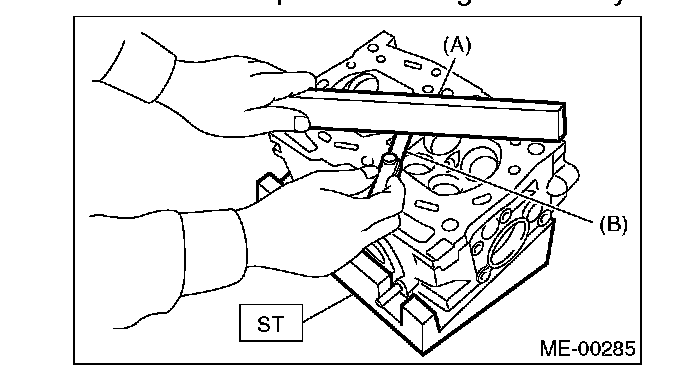 3. Measure the warping of the cylinder head surface that mates with cylinder block using a straight edge (A) and thickness gauge (B). If the warping exceeds the limit, correct the surface by grinding it with a surface grinder.