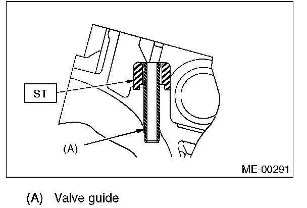 5. Put a new valve guide, coated with sufficient oil, in cylinder, and insert the ST1 into valve guide. Press in until the valve guide upper end is flush with the upper surface of ST2.