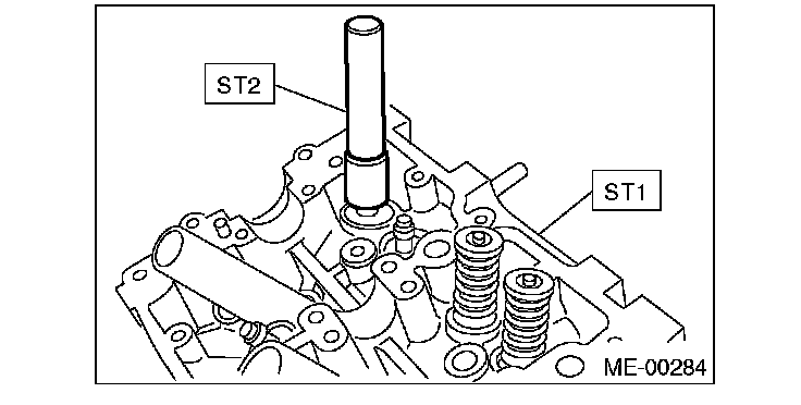 1. Place the cylinder head on ST1 with the combustion chamber upward so that valve guides fit the holes in ST1.