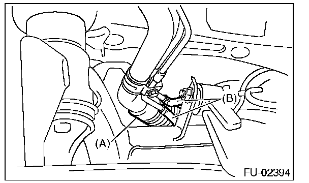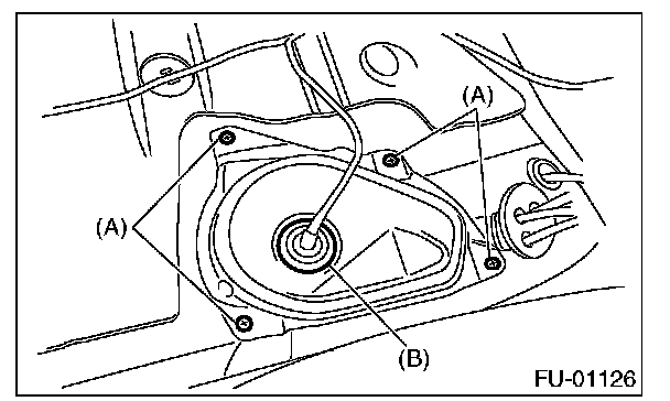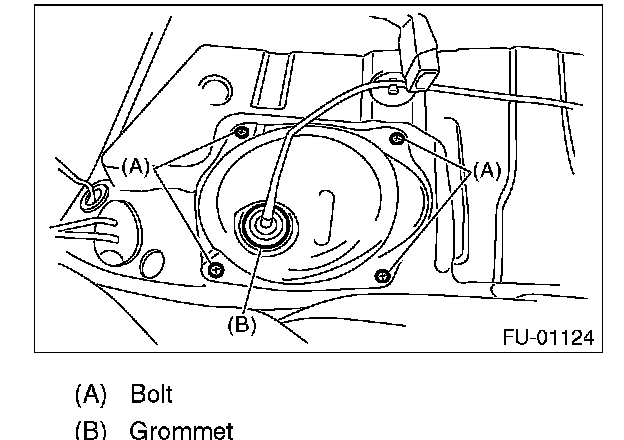 2. Push the grommet (B) down and remove the service hole cover.