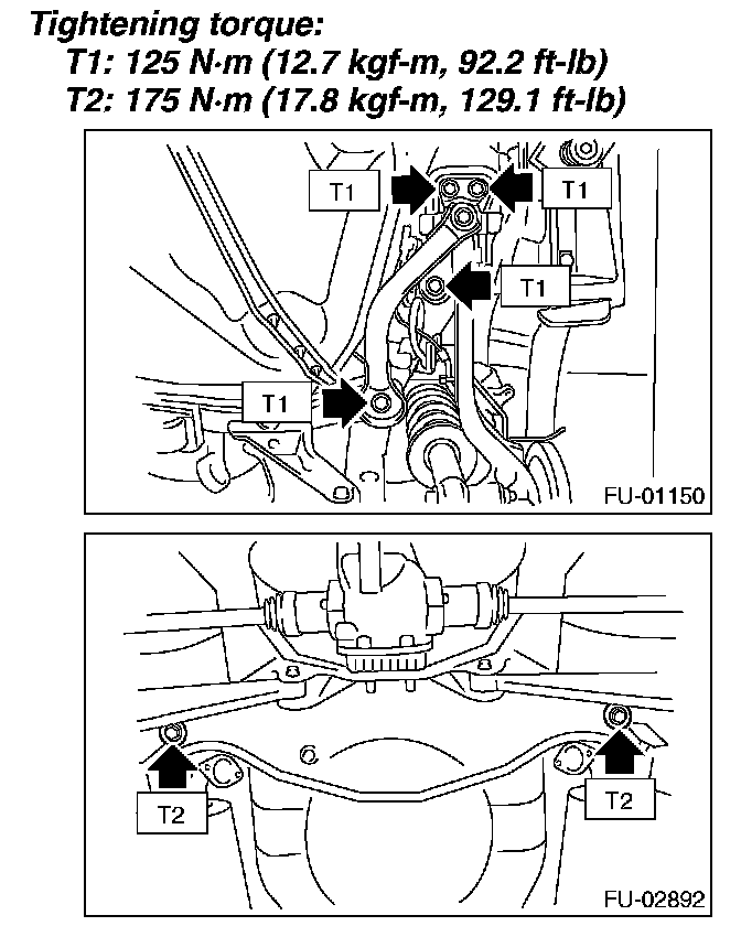 2. Support the rear suspension assembly, and tighten the bolts which secure the rear suspension assembly to the body.