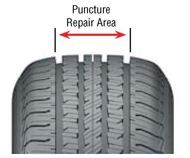 ^ The puncture injury is 1/4 inch (6 mm) or less and must be within the tread area as shown in the graphic. This helps ensure long-term tire and repair durability.