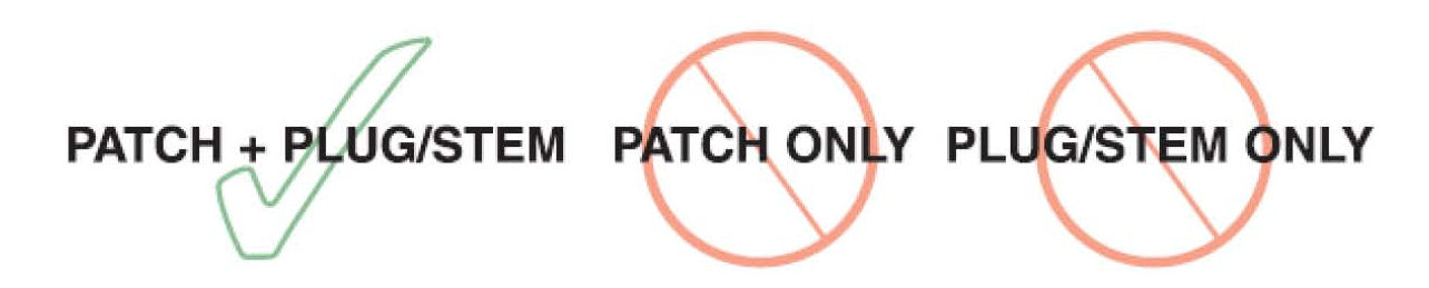 ^ A patch is applied to the interior of the tire and the puncture hole is filled with a suitable plug/stem filler. This helps ensure that the interior of the tire is adequately sealed to prevent inflation pressure loss and prevents contamination of the steel belts and other plies