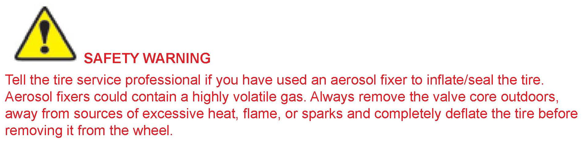 Emergency/Temporary Sealant or Filler Repairs: An emergency/temporary sealant or filler injected into the tire, such as by aerosol can or injection/squeeze-tube, is not a proper repair and voids the tire Limited Warranty. A tire injected with such sealant/filler must be replaced by
