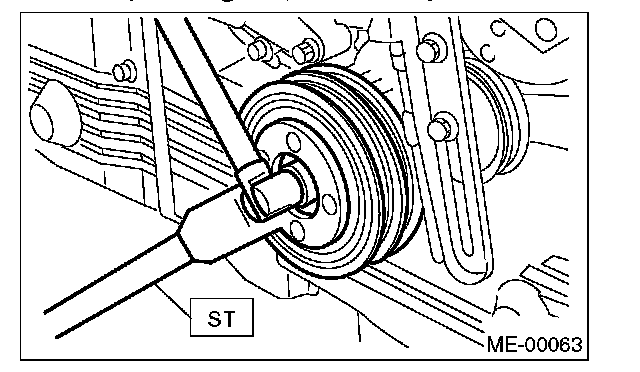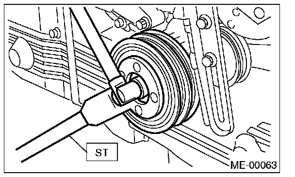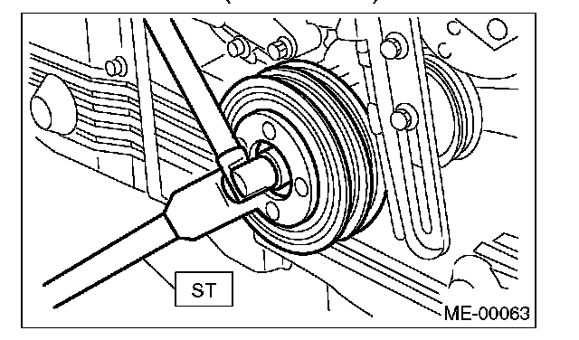 2. Use the ST to lock the crank pulley, and remove the crank pulley bolts.