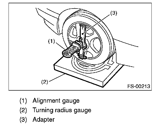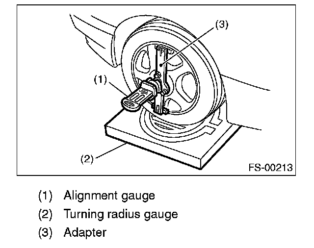 1. Place the front wheel on the turning radius gauge. Make sure the ground contact surfaces of the front and rear wheels are at the same height.