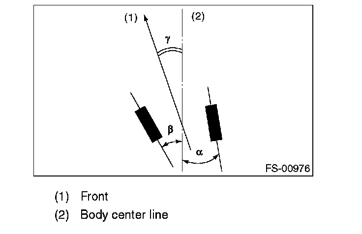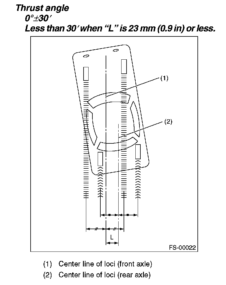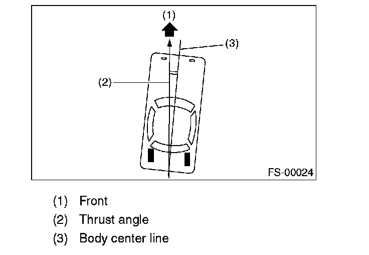 NOTE: Thrust angle is a mean value of left and right wheel toe angles in relation to the vehicle body center line. Vehicle is driven straight in the thrust angle direction while slanting in the oblique direction depending on the degree of the mean thrust angle.