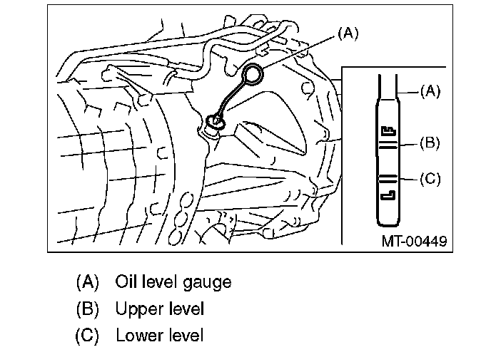 5. Pull out the oil level gauge again, and check the oil level. If it is at the lower level or less, add oil through the oil level gauge hole to bring the level up to the upper level.