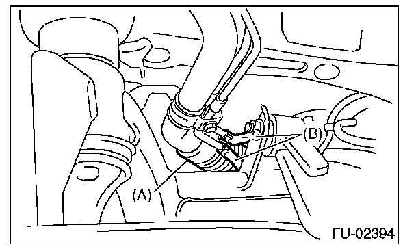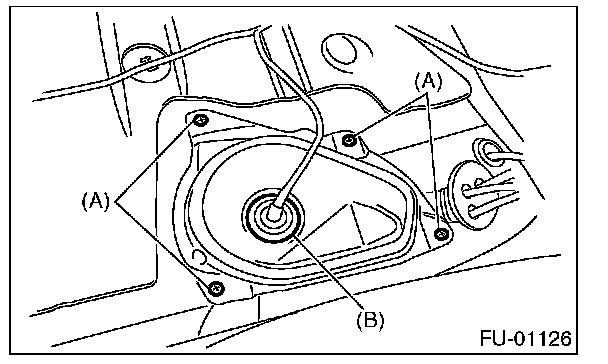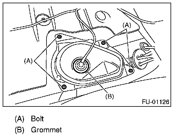 2. Push the grommet (B) down and remove the service hole cover.