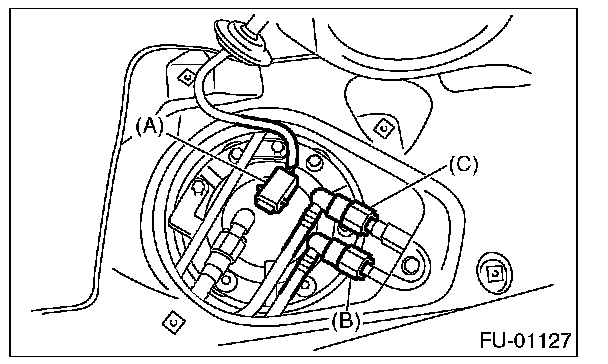 11. Disconnect the quick connector of fuel delivery (B) and return hose (C).