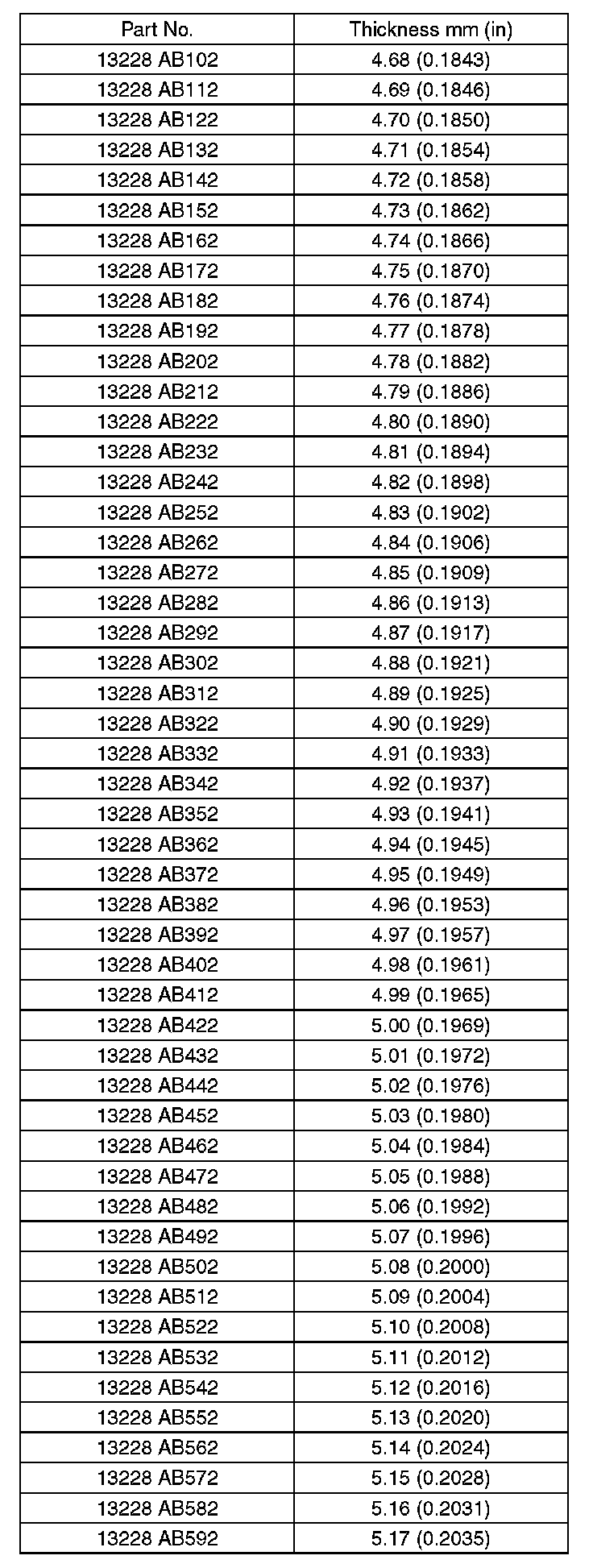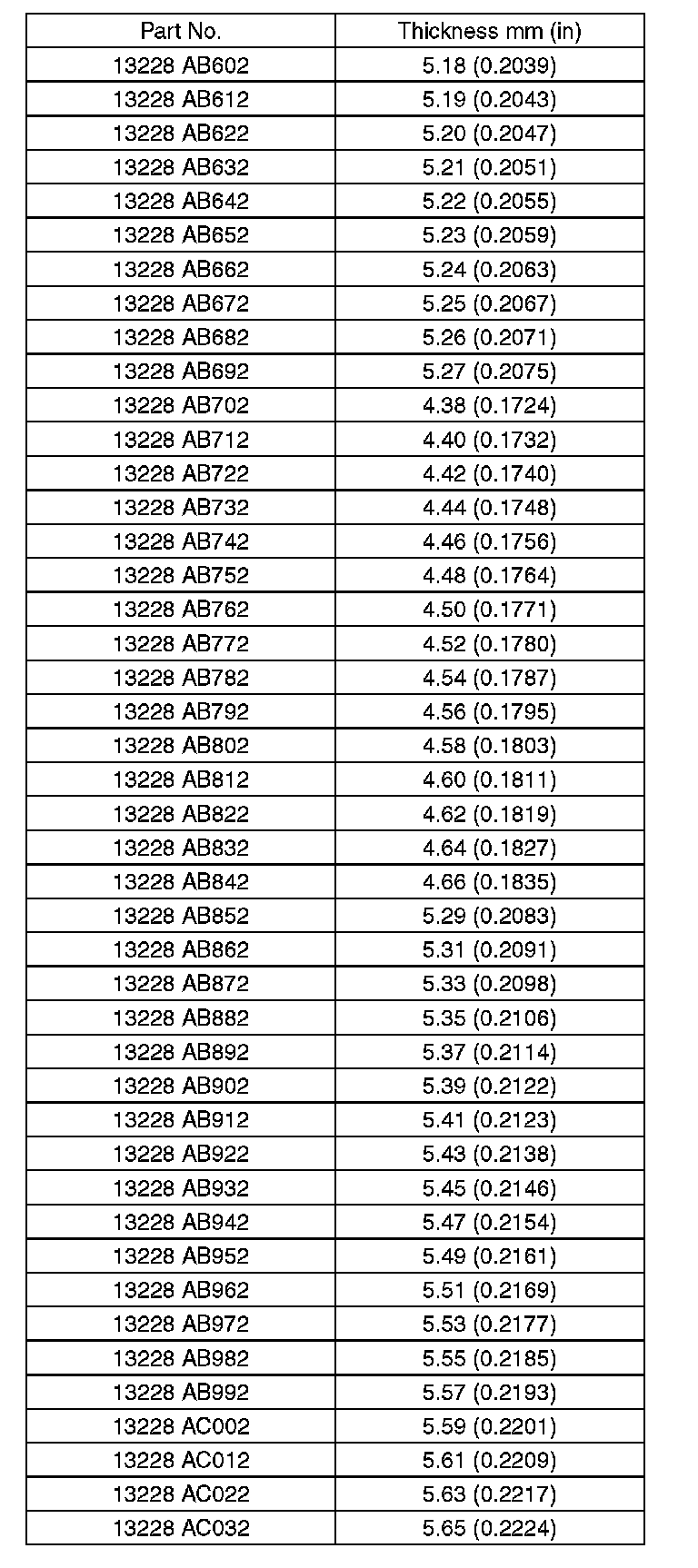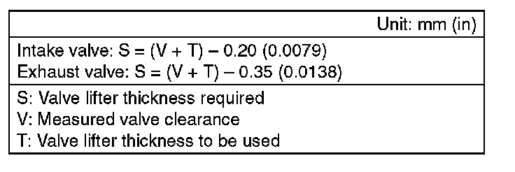 5. Select a valve lifter of suitable thickness from the following table using the measured valve clearance and valve lifter thickness, and install it.