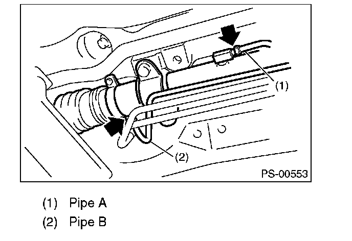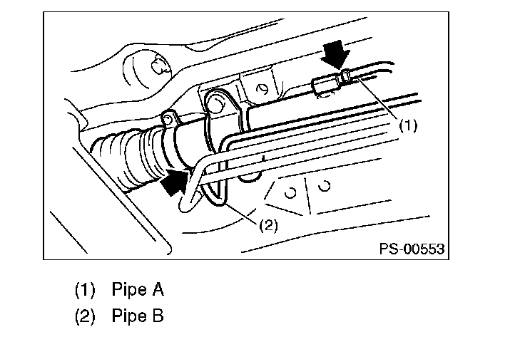 3. Remove the one pipe joint at the center of the gearbox, and connect the vinyl hose to the pipe and the joint. Discharge the fluid by turning the steering wheel fully clockwise and counterclockwise. Discharge the fluid similarly from other pipes.