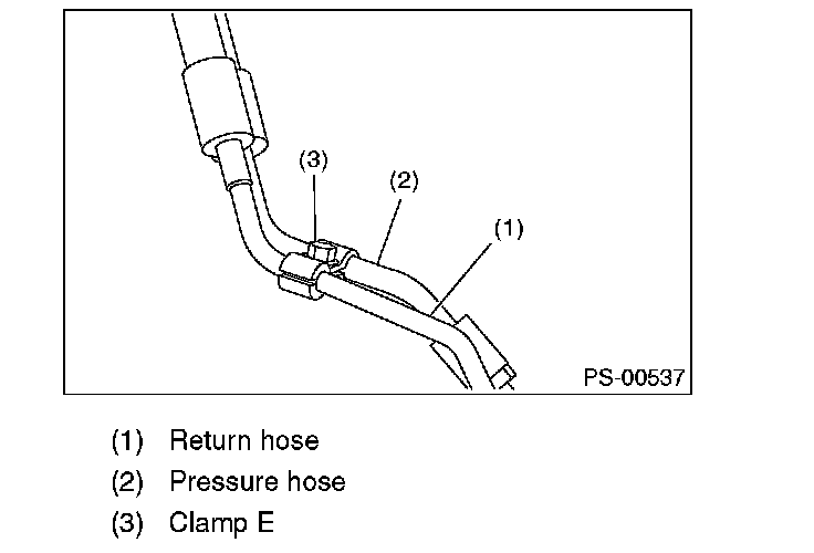 4. Remove the clamp E from return hose and pressure hose.