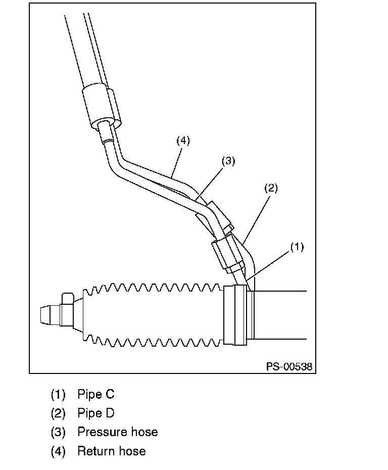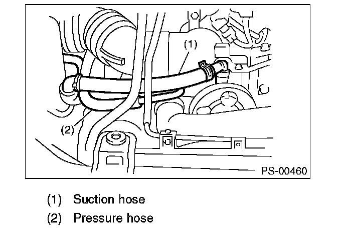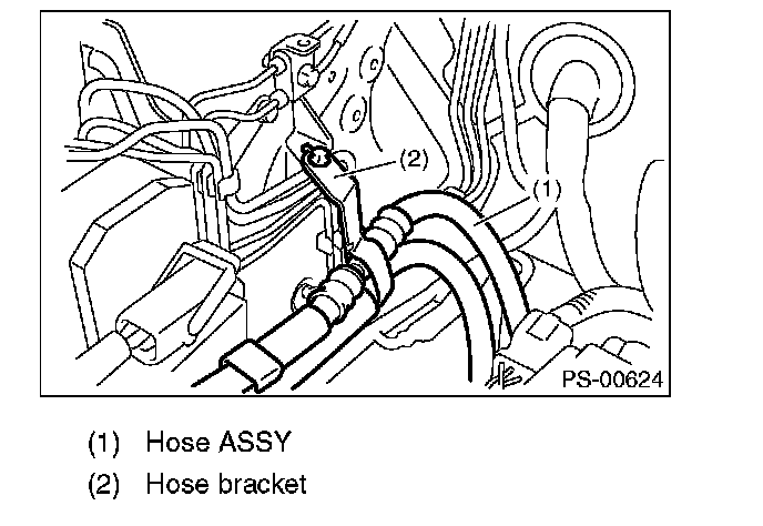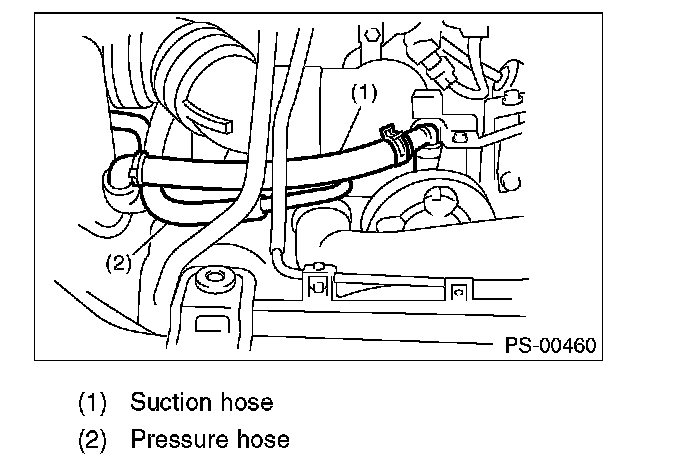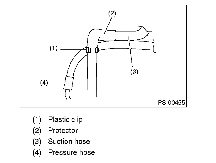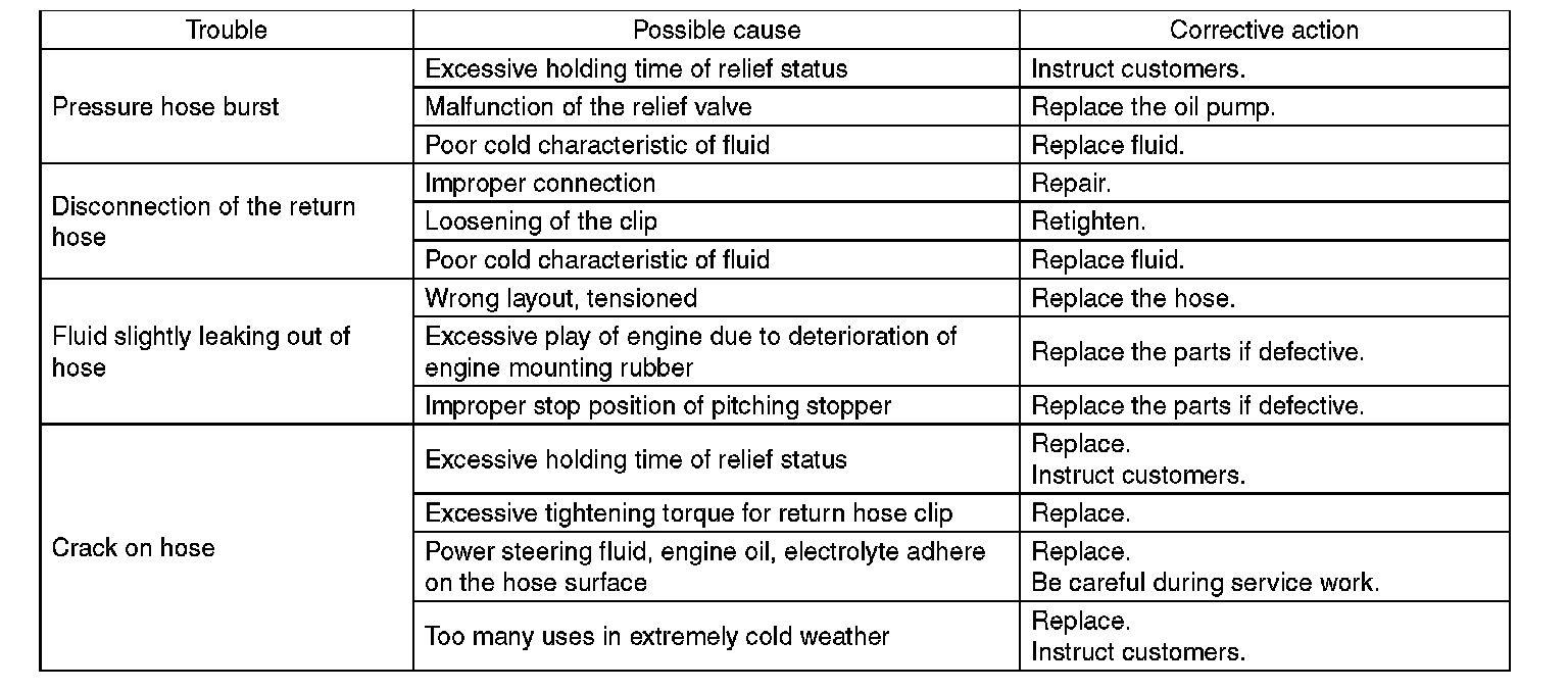 CAUTION: Although the surface layer materials of rubber hoses have excellent weathering resistance, heat resistance and resistance for low temperature brittleness, they are likely to be damaged chemically by brake fluid, battery electrolyte, engine oil and automatic transmission fluid and their service lives are to be very shortened. Wipe off hoses immediately if any of these come into contact with the hoses. Since resistances for heat or low temperature brittleness are gradually declining according to time accumulation of hot or cold conditions for the hoses and their service lives are shortening accordingly, it is necessary to perform careful inspection frequently when the vehicle is used in hot weather areas, cold weather areas and a driving condition in which many steering operations are required in short time.