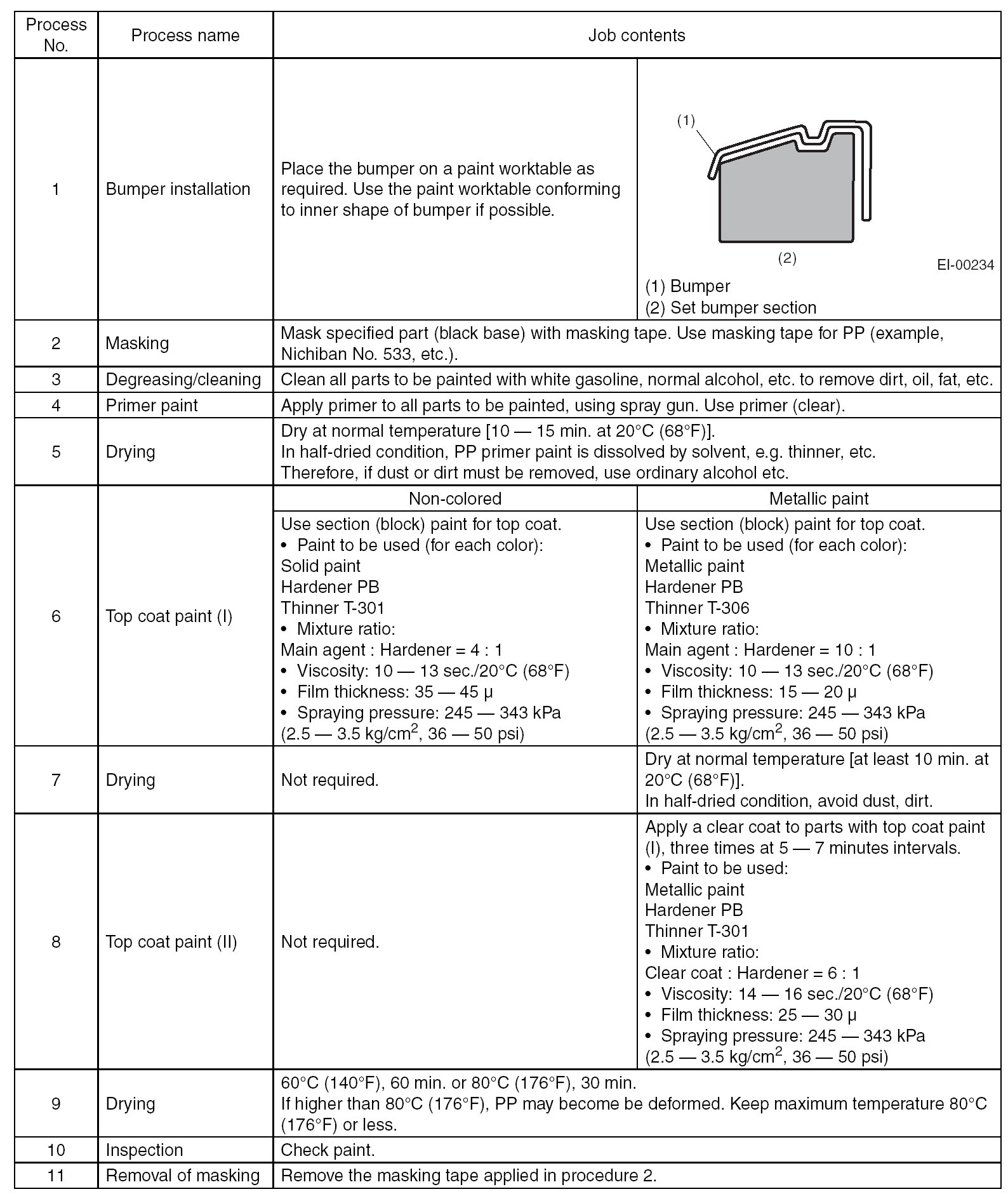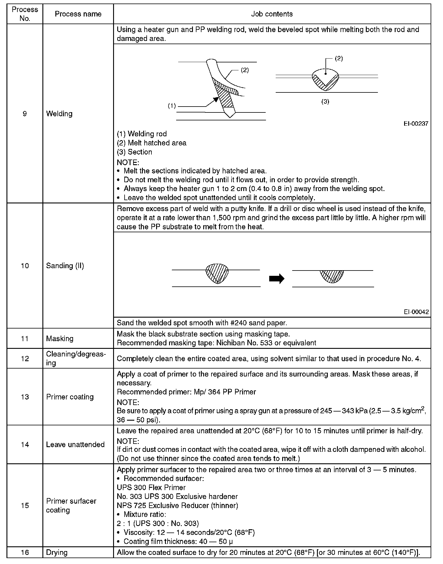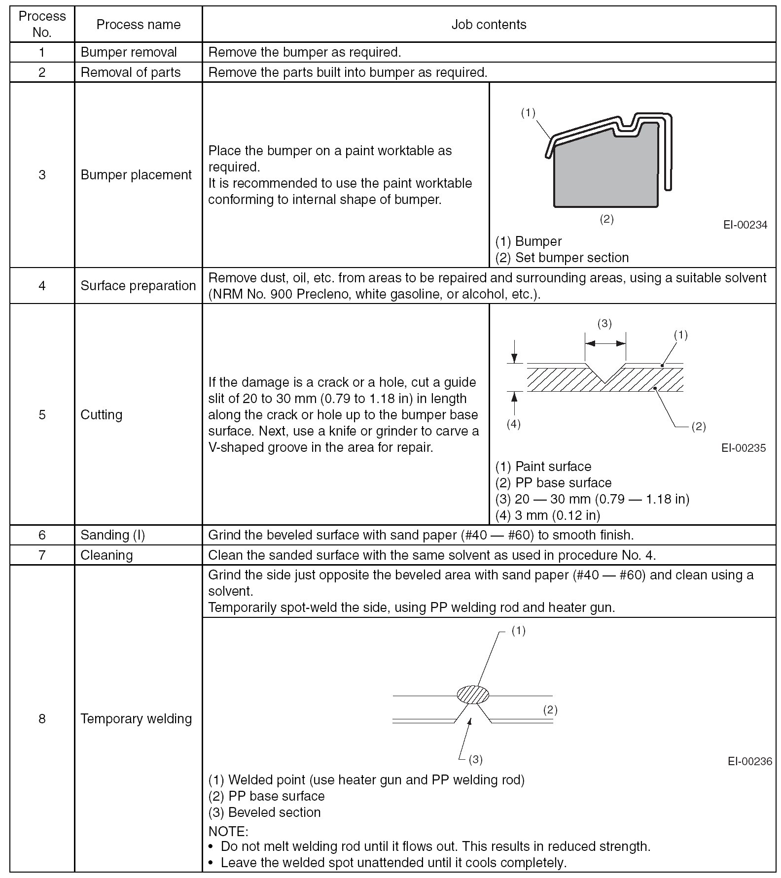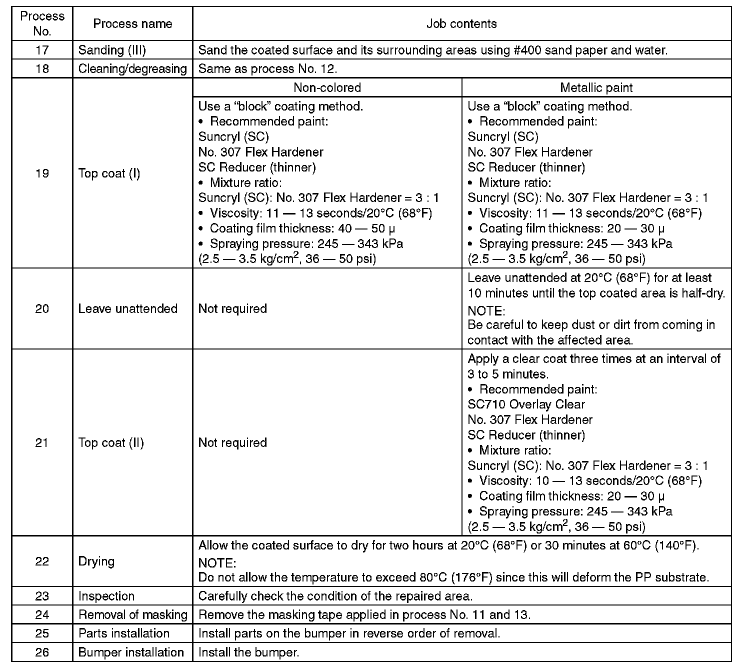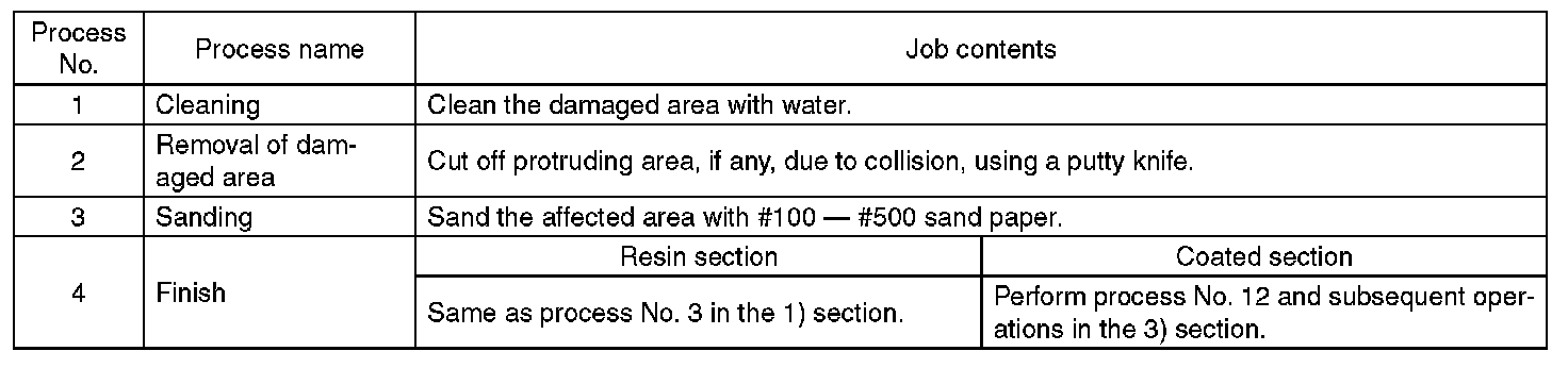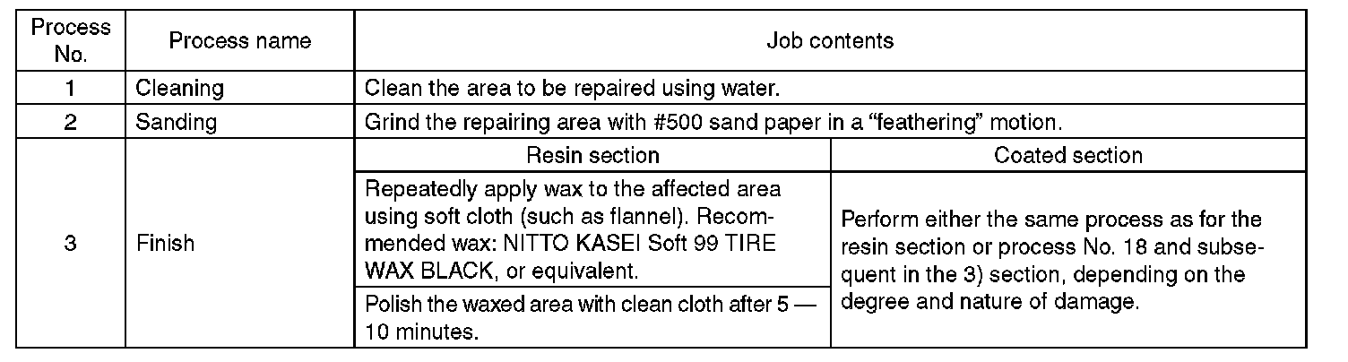NOTE: All PP bumpers are provided with a grained surface, and if the surface is damaged, it cannot normally be restored to its former condition. Damages limited to the shallow scratches that cause only a change in the luster of the base material or coating, can be almost fully restored. Before repairing a damaged area, explain this point to the customer and obtain an understanding about the matter. Repair methods are outlined below, based on a classification of the extent of damage.