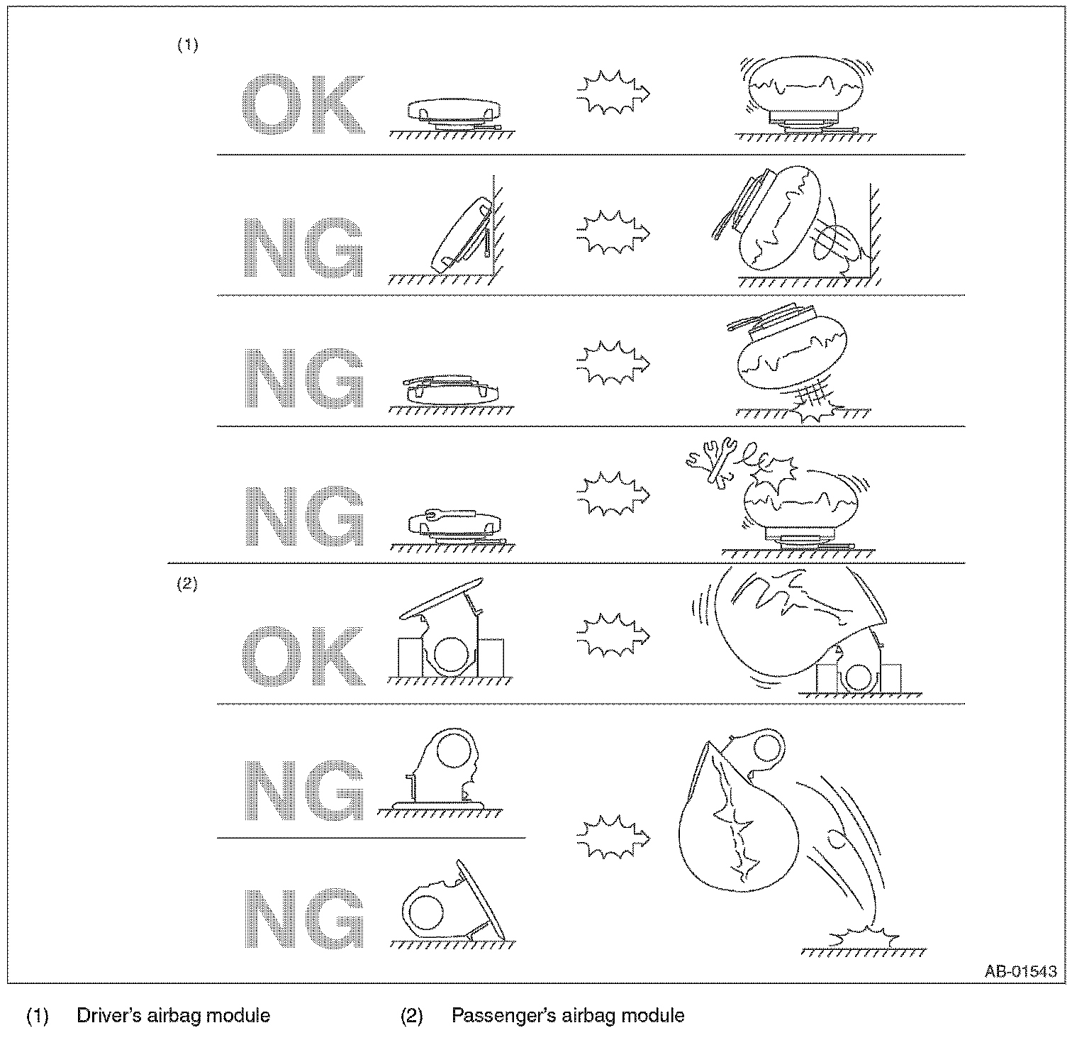 - When storing a removed airbag module, do not place with its pad side facing down. Do not place any objects on the airbag module. Do not pile up the airbag module. If the airbag inflates for some reason when an airbag module pad is touching other objects, it may cause serious accident.