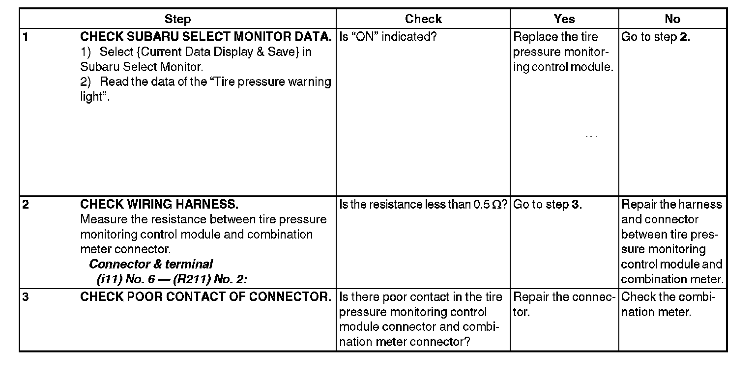 NOTE: When the tire pressure warning light is OFF and "No diagnostic Code Present" will be displayed on the Subaru Select Monitor, the system is in a normal condition.