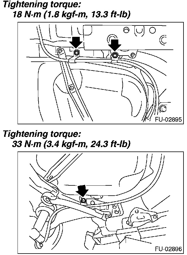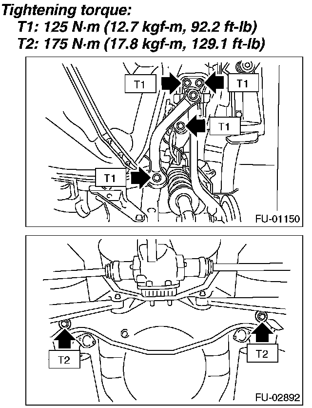 2. Support the rear suspension assembly, and tighten the bolts which secure the rear suspension assembly to the body.